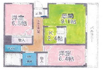 居間9.1帖、洋室6.5帖、洋室6.4帖、台所2.4帖、押入れ2ヶ所、UT、浴室。
